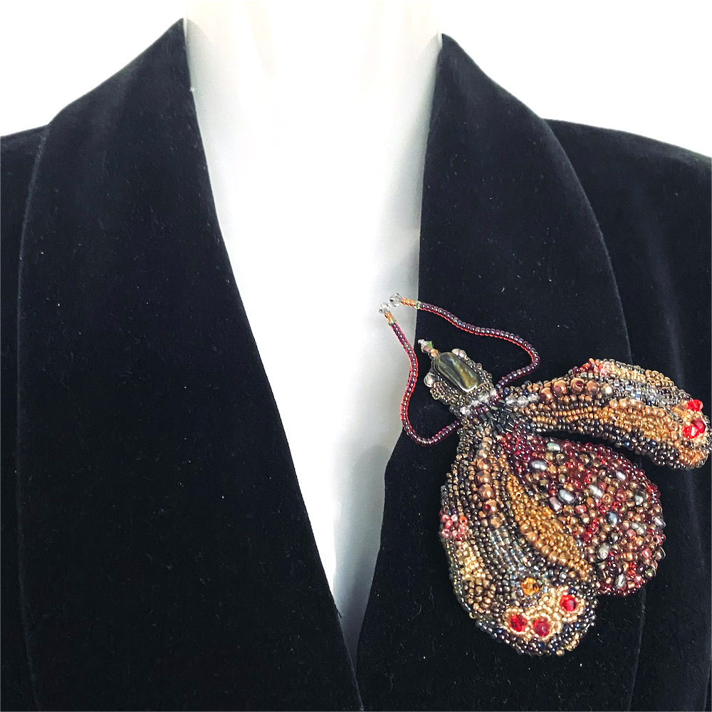 prendedor hecho a mano con cristales, pedrería y mostacillas y terminación de cuero.