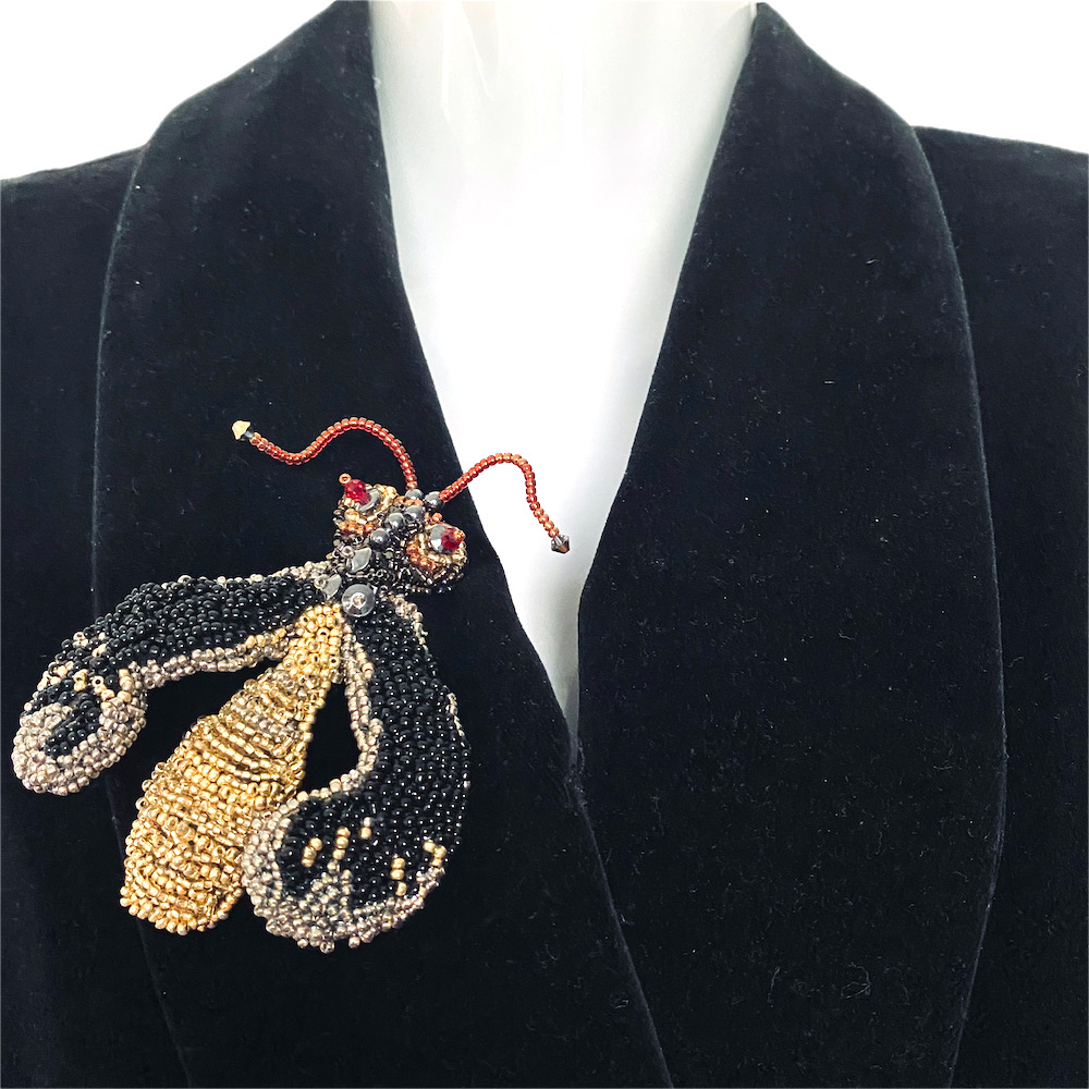 prendedor hecho a mano con cristales, pedrería y mostacillas y terminación de cuero.