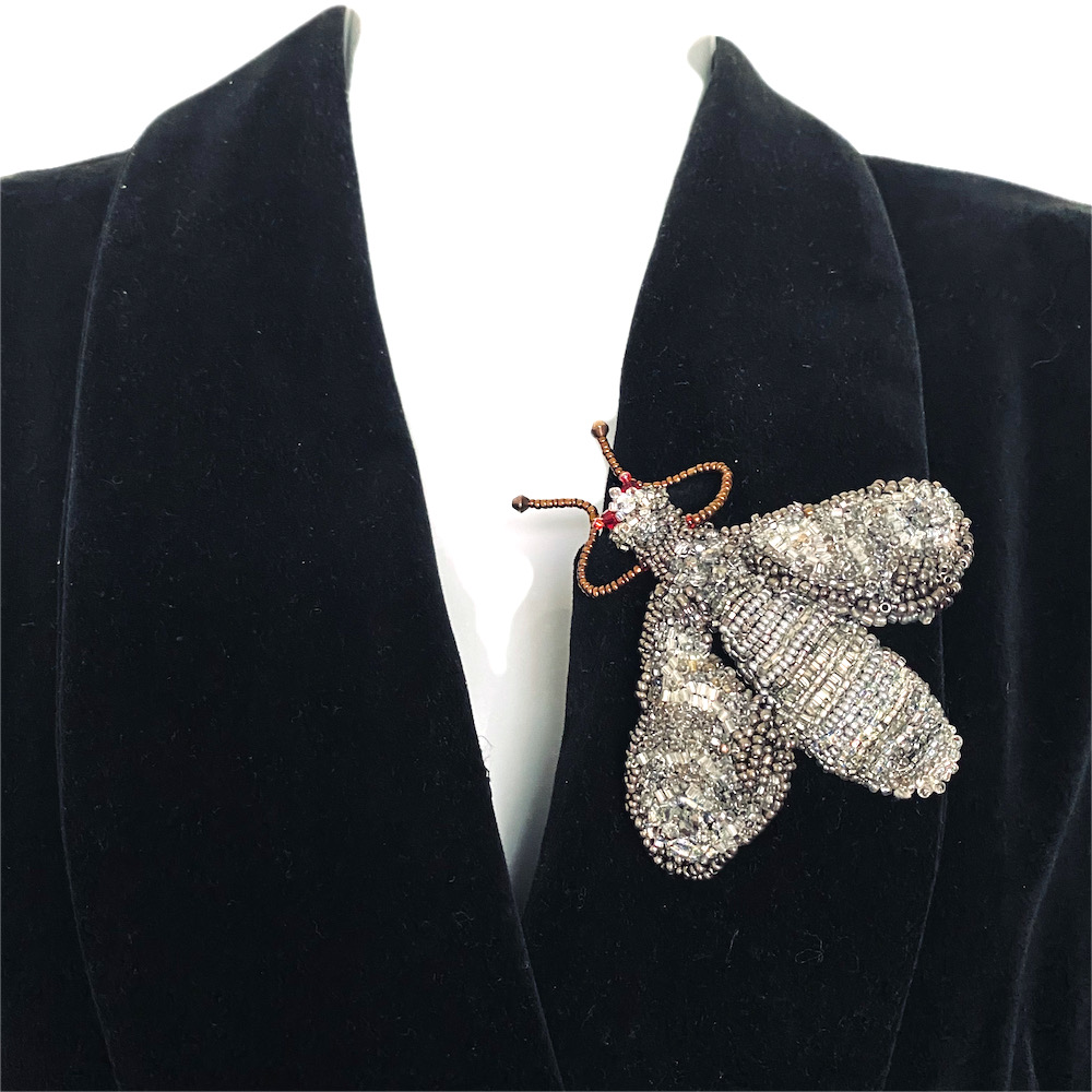 prendedor hecho a mano con cristales, pedrería y mostacillas y terminación de cuero.