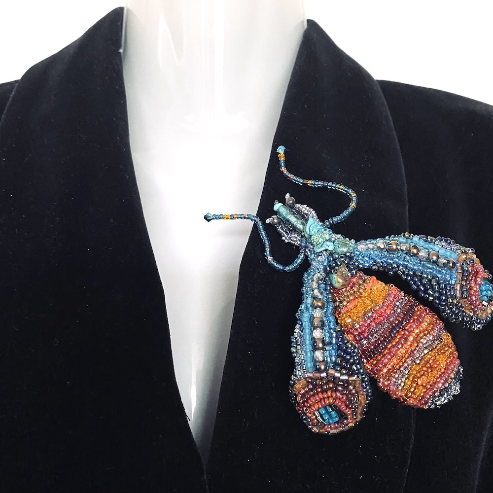prendedor hecho a mano con cristales, pedrería y mostacillas y terminación de cuero.