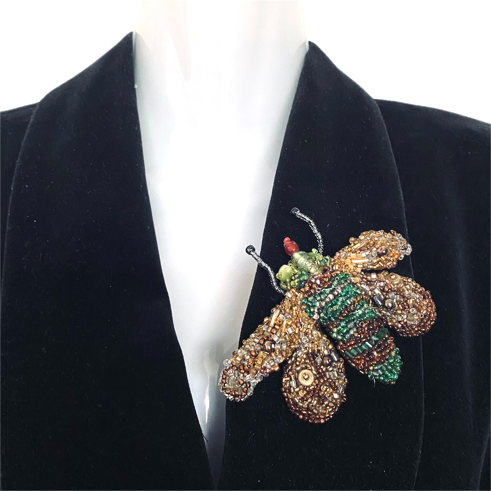 prendedor hecho a mano con cristales, pedrería y mostacillas y terminación de cuero.